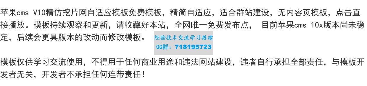 苹果cms V10精仿挖片网自适应模板免费模板,精简自适应,适合群站建设,无内容页模板,点击直 接播放。模板持续观察和更新,请收藏好本站,全网唯一免费发布点,目前苹果cms 10x版本尚未稳 定,后续会更具版本的改动而修改模板。