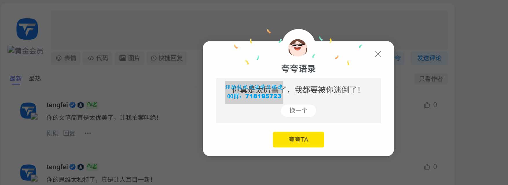 子比主题夸一夸插件给子比主题评论的地方加一个夸一夸的插件,非常的快捷方便,方便的可以使用,快速插入到子比主题评论区并且自动发送评论,非常方便......