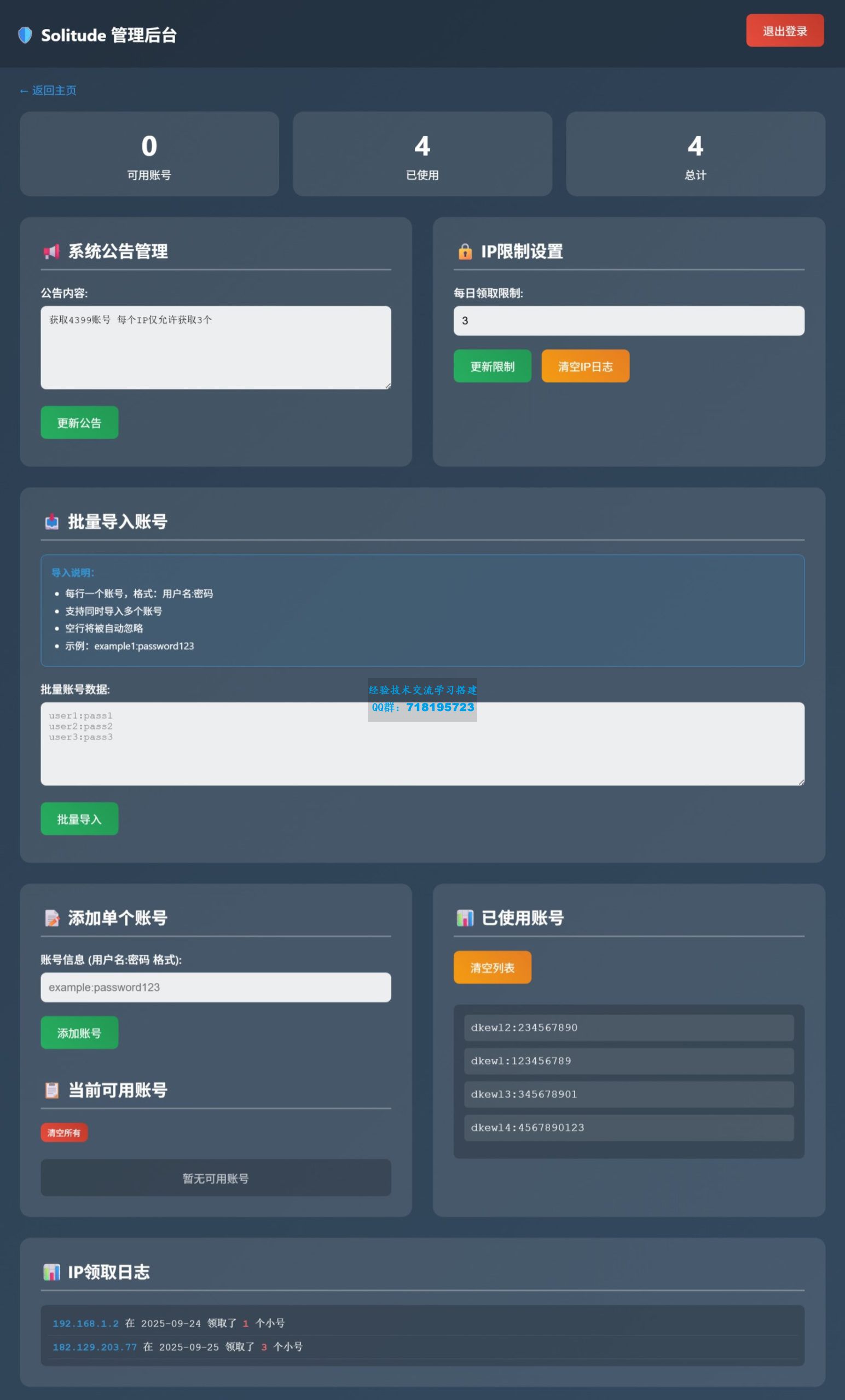 此为小号分发卡密系统源码,专用于分发小号库存账号或卡密等使用,不过规定每个IP仅能领取3次,也可视作小号分发工具。