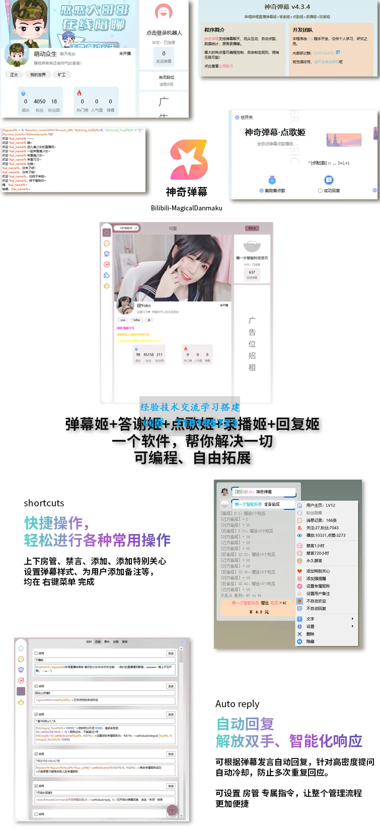 本程序以打造自动化直播间为主线,以建设高粘性粉丝团体为目标,保持观众互动,实现粉丝裂变,打造直播高峰,做有温度的直播助手。与此同时,规范观众行为秩序,促进直播产业健康有序发展,营造清朗的网络环境。
